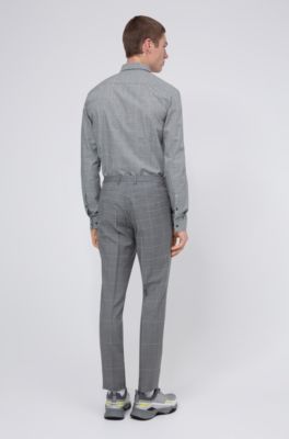 Het merk hugo heeft moderne casual kleding in de collecties. In de collectie vind je naast kostuums overhemden colberts en pullovers ook. Hugo boss regular fit pak van italiaanse wol met dessin. Heren pakken outlet van hugo boss.