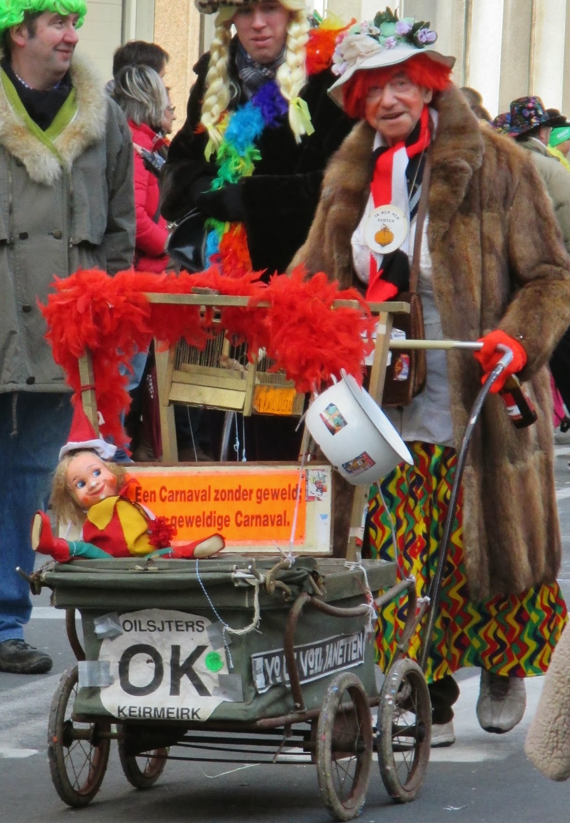 Op dinsdag is er altijd een voil jeanettenstoet. Jeanet was dan ook een scheldwoord voor een man die zich in vrouwenkleren hulde. Een voil jeanet was een proletarier iemand die geen kostuum kon huren of kopen en die zich dan maar vermomde met wat hij of zij thuis kon vinden en dat waren vaak de oude kleren van de echtgenote moeder of de grootmoeder. Egon twin 41 heeft gisteren zijn jawoord gegeven in voil jeanetten kostuum.